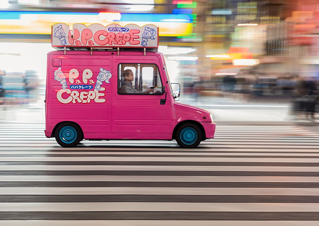 A mobile crepe sales truck captured in Akihabara, the vibrant manga and electronic district of Tokyo.