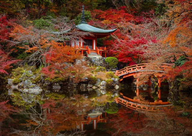 The beautiful Sanboin Palace Garden at Daigo-ji against a vibrant autumn backdrop, with fiery red and orange leaves framing it's beauty.